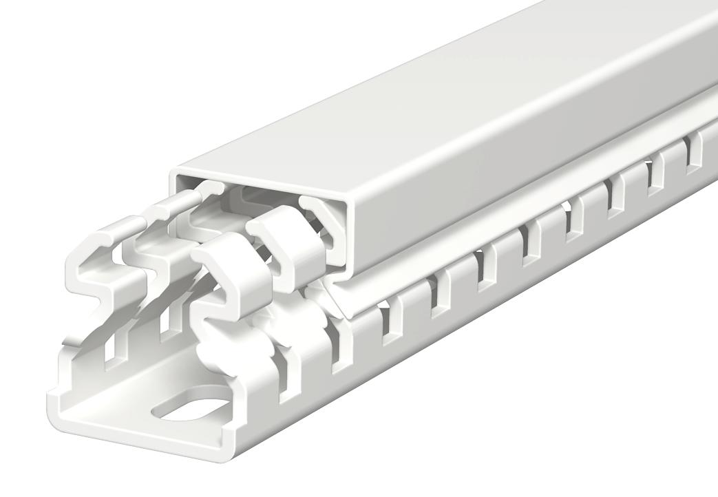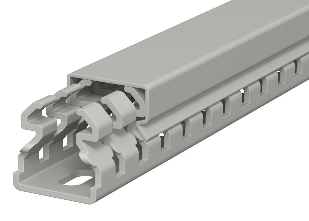 Product descriptionWiring duct according to DIN EN 50085-2-3, incl. cover and base perforation, for horizontal and vertical routing of electrical cables in the switchgear cabinet. Designed as a DIN duct. Retainers are broken out without tools. The flush-floor routing of cables is possible through predetermined break points. Tested to DIN EN 50085-2-3. Special lengths on request.
