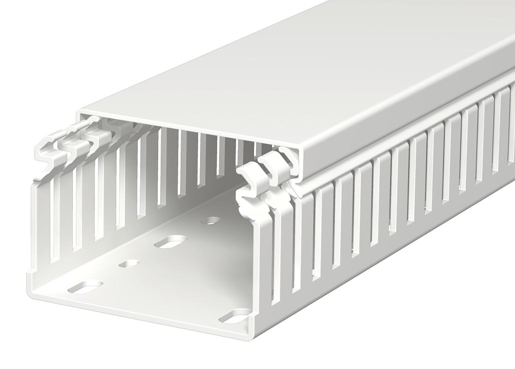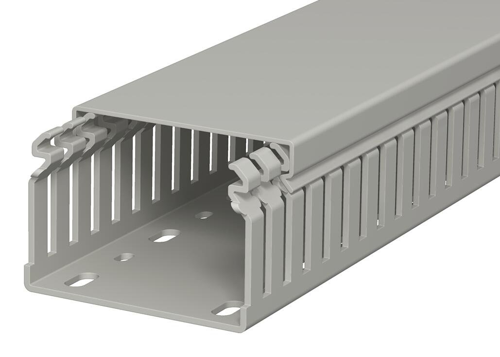 Product descriptionWiring duct according to DIN EN 50085-2-3, incl. cover and base perforation, for horizontal and vertical routing of electrical cables in the switchgear cabinet. Designed as a DIN duct. Retainers are broken out without tools. The flush-floor routing of cables is possible through predetermined break points. Tested to DIN EN 50085-2-3. Special lengths on request.