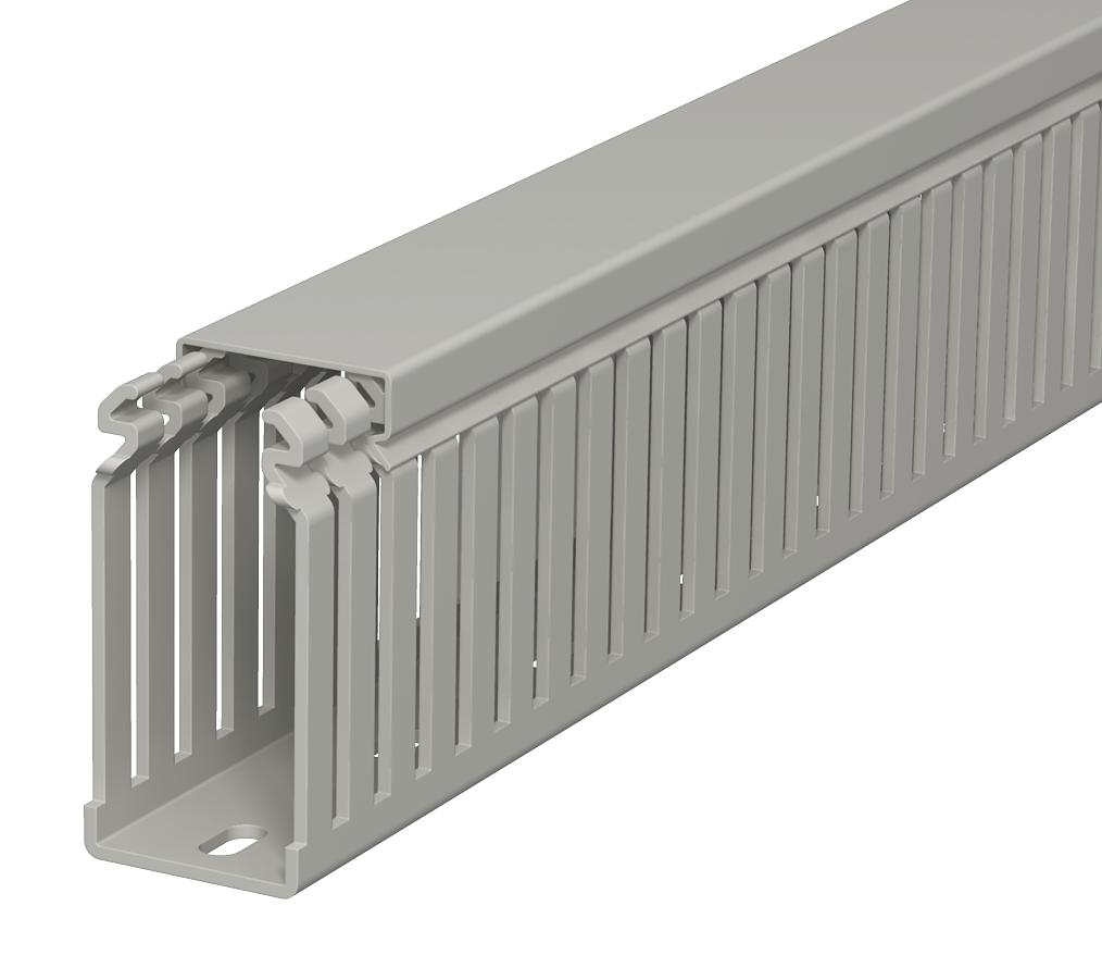 Product descriptionWiring duct according to DIN EN 50085-2-3, incl. cover and base perforation, for horizontal and vertical routing of electrical cables in the switchgear cabinet. Designed as a DIN duct. Retainers are broken out without tools. The flush-floor routing of cables is possible through predetermined break points. Tested to DIN EN 50085-2-3. Special lengths on request.