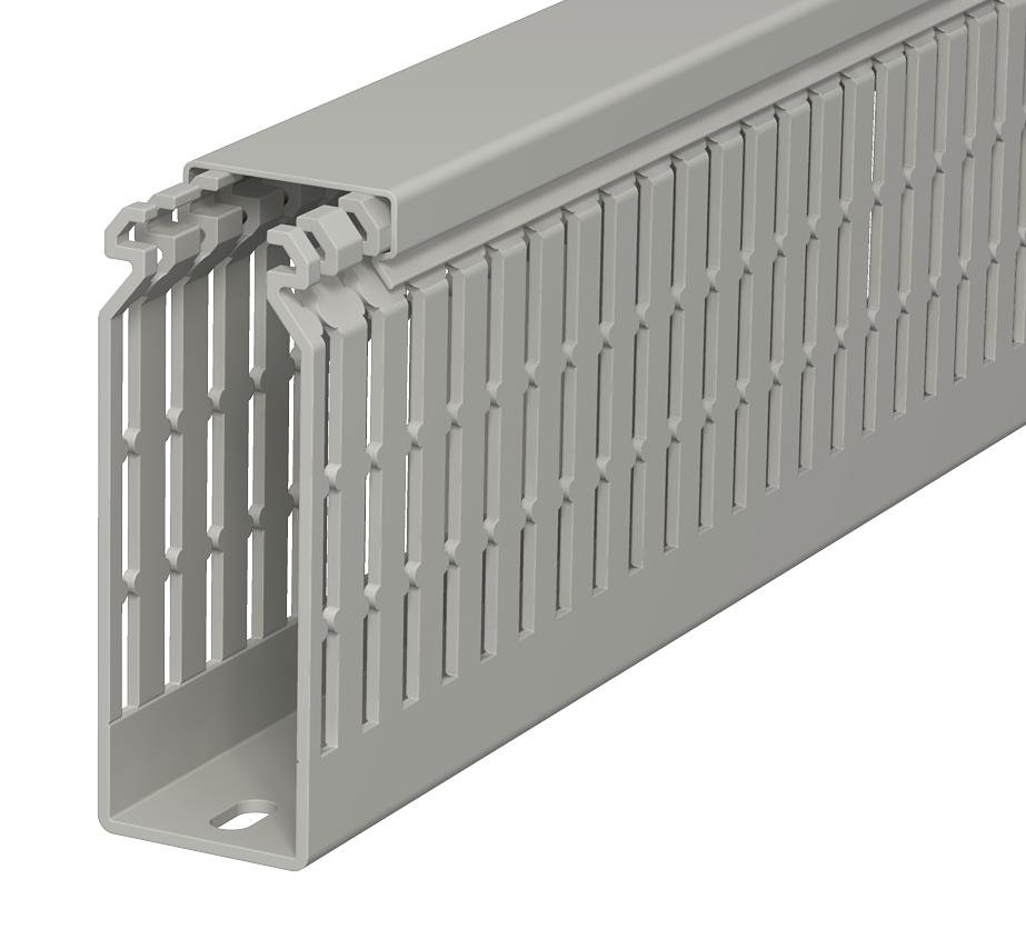 Product descriptionWiring duct according to DIN EN 50085-2-3, incl. cover and base perforation, for horizontal and vertical routing of electrical cables in the switchgear cabinet. Designed as a DIN duct. Retainers are broken out without tools. The flush-floor routing of cables is possible through predetermined break points. Tapering in the side slots prevents the cables from falling out. Tested to DIN EN 50085-2-3. Special lengths on request.