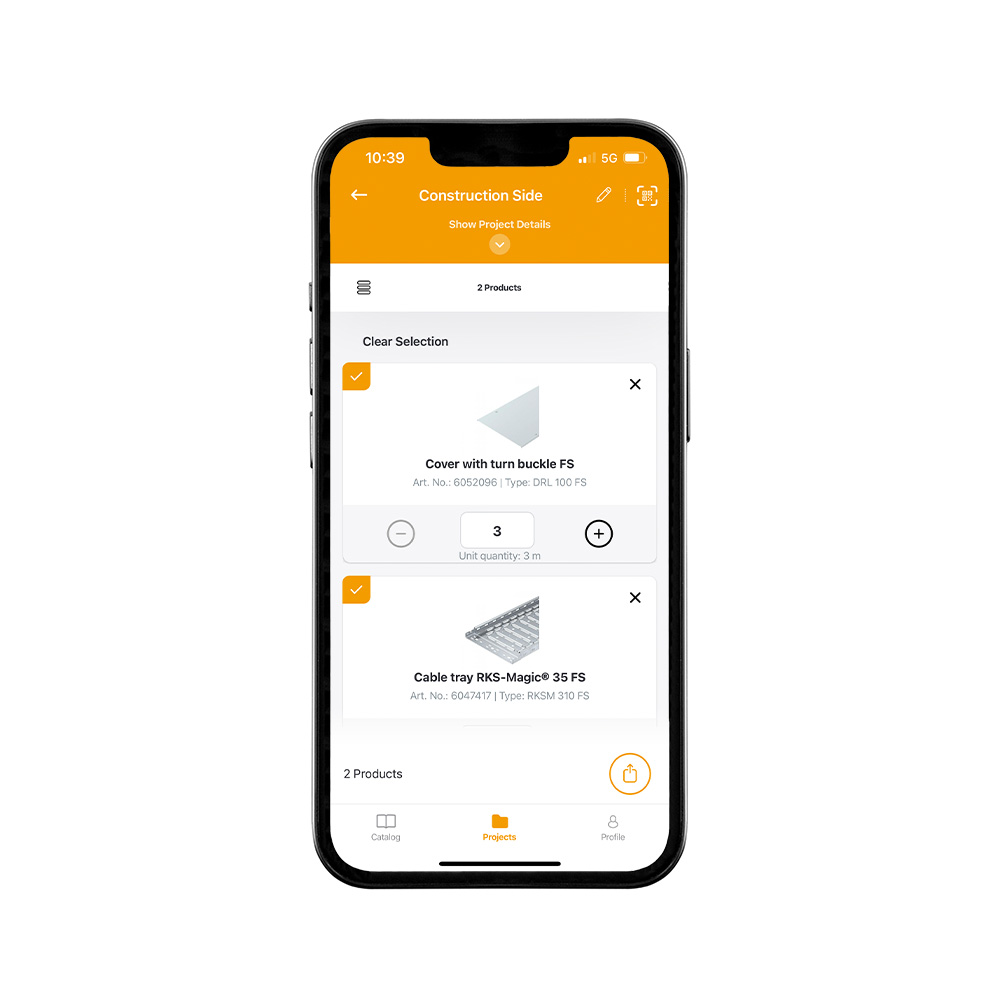 Create your own projects and add any products from OBO's catalogues in an uncomplicated manner. You can export your projects as a CSV file with just a single click. A parts list is compiled automatically for each project.