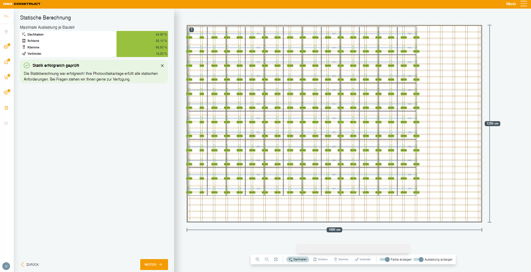Create your PV project online, edit it and save your plan. Our tool automatically calculates the required quantity for the different components and generates a plan-based sub-construction and module planning graphic. Simply download this, as well as invitations to tender and various documents for the static calculation of our mounting construction in different file formats.